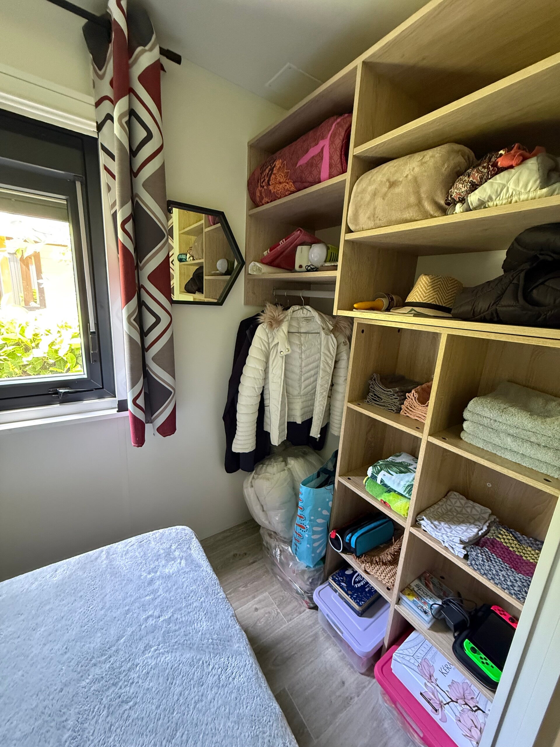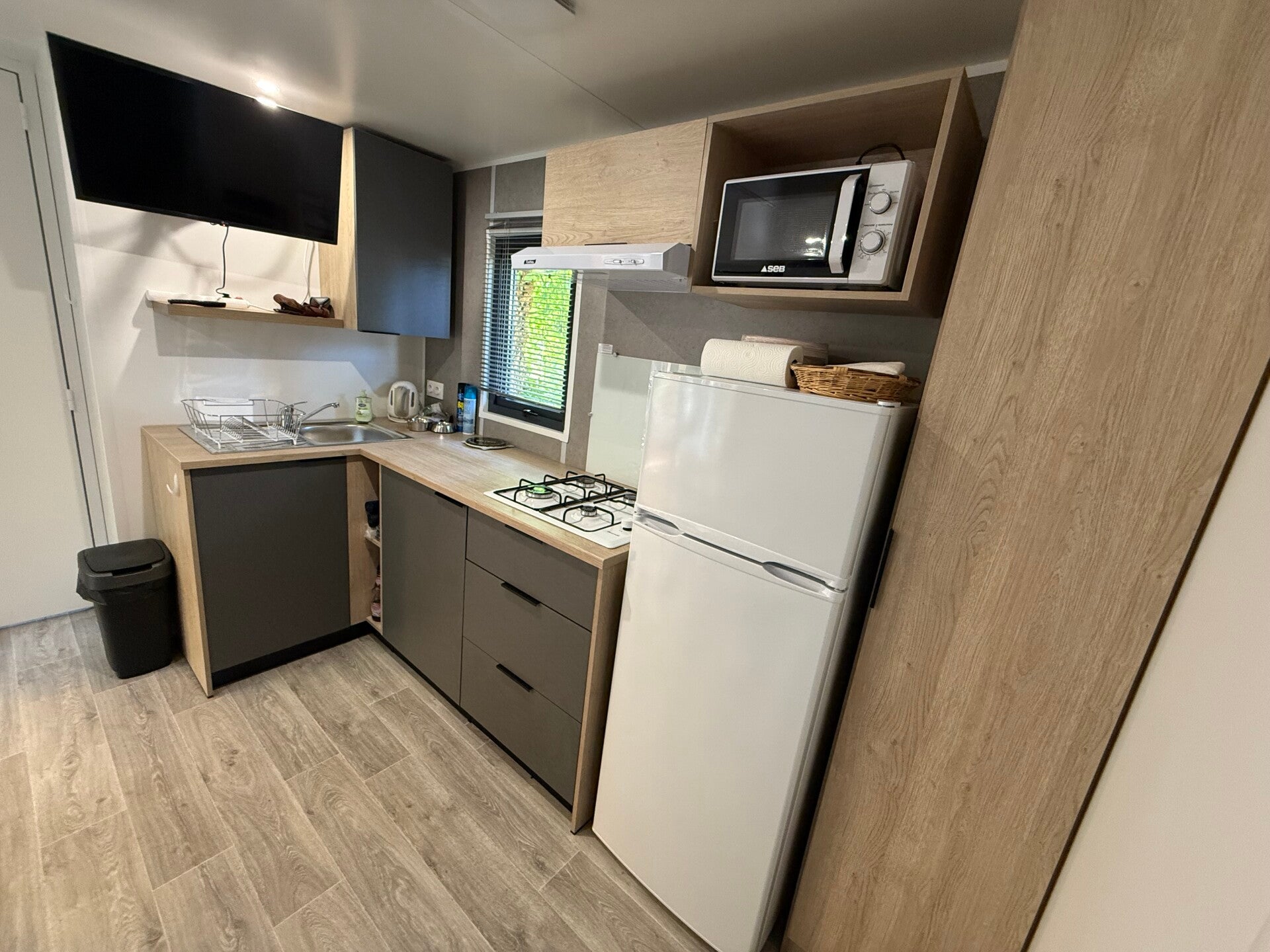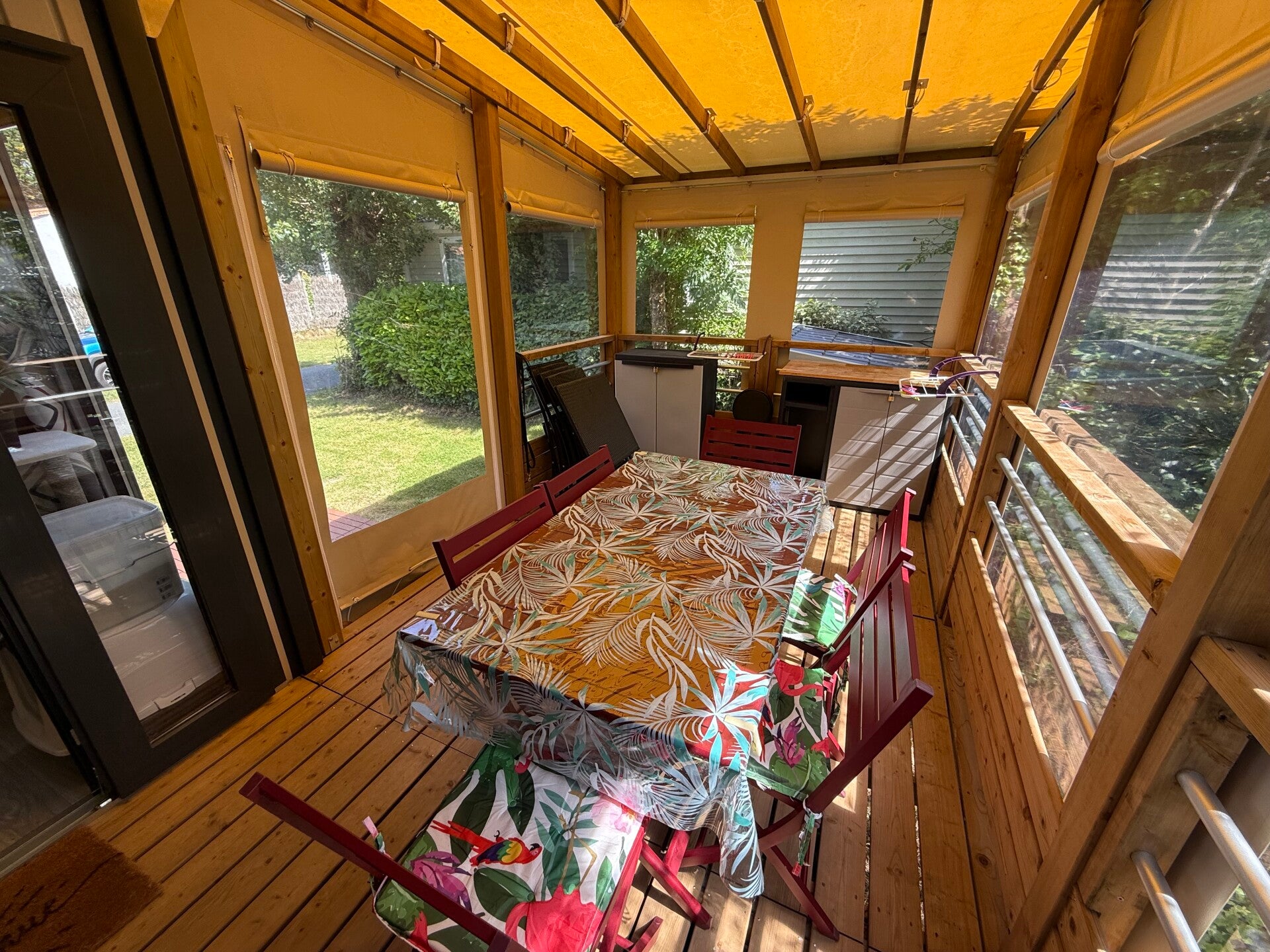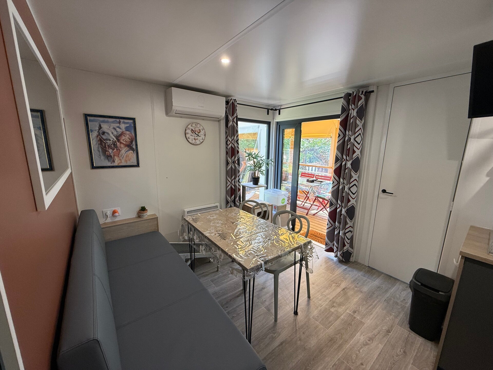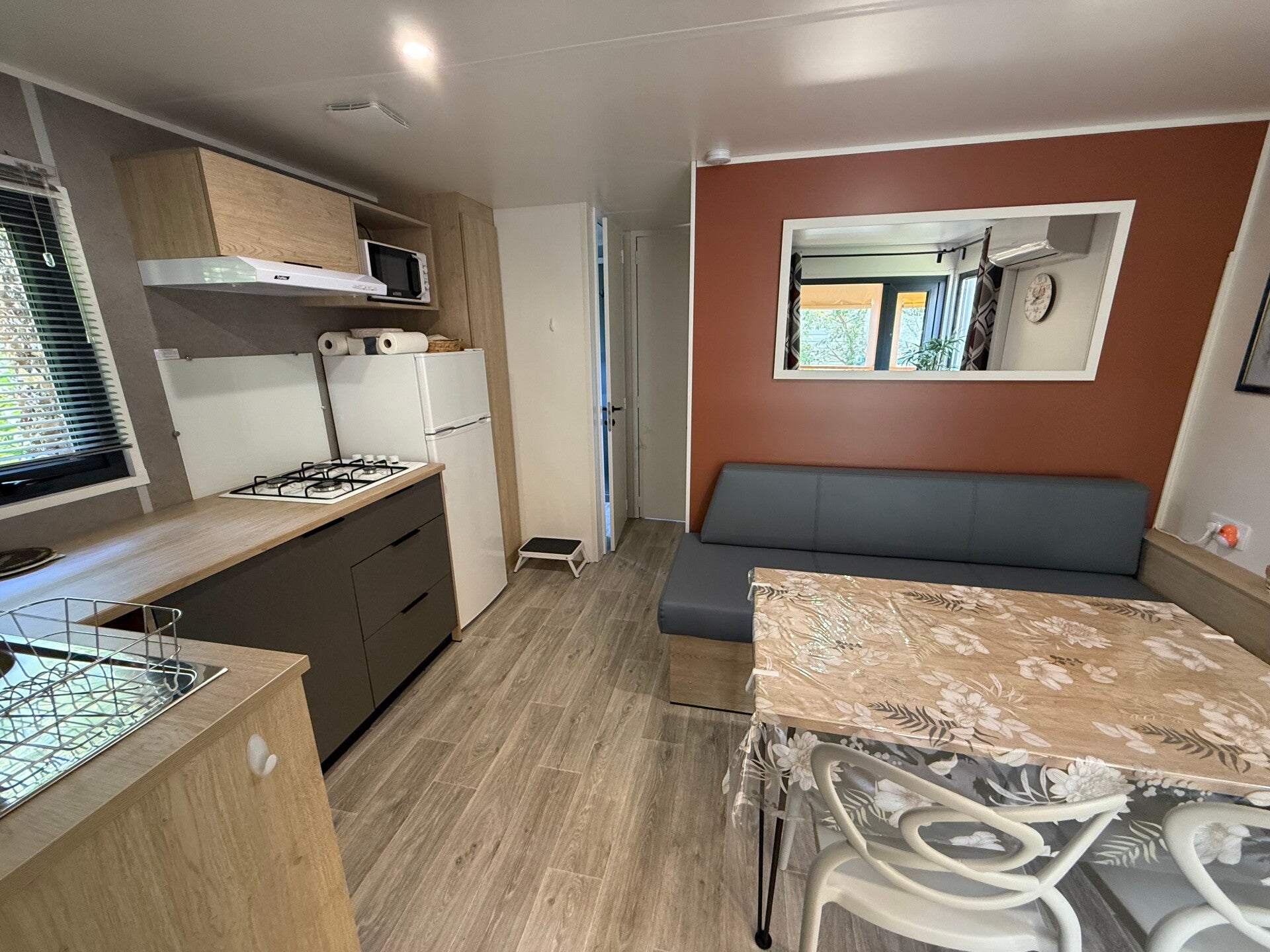 Cuisine meublée avec hotte, Volets roulants ,stores occultant-moustiquaire, climatisation réversible , inventaire avec salon de jardin pour 4-6 pers, 2 TV , canapé lit, coffre de rangements etc ….